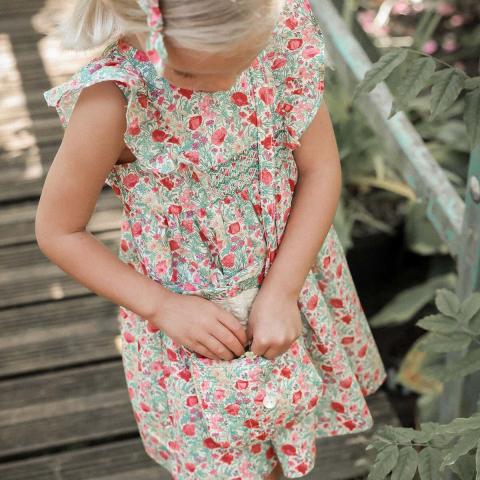 Sur un tissu Liberty se posent des smocks brodés réalisés à la main. Une robe raffinée confectionnée avec le plus grand soin par nos partenaires de Madagascar. Smocks brodés réalisés à la main Volants devant et dos Ouverture totale au dos par boutons