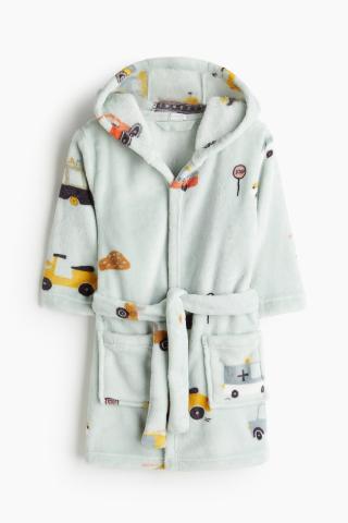 Robe de chambre à motif en tissu polaire doux. Modèle à capuche avec ceinture à nouer à la taille et poches devant.