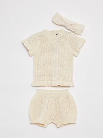 Ne vous prenez pas la tête pour habiller bébé et optez pour cet ensemble sobre et mignon. - Ensemble 3 pièces en tricot - T-shirt - Manches courtes - Col rond - Bords volantés - Finitions bords côtes - Demi-ouverture boutonnée au dos - Couleur unie - Short assorti - Taille élastiquée - Couleur unie - Bandeau assorti - Nœud décoratif - Couleur unie