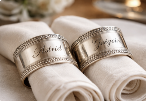 Ce produit est extrait d'une liste de mariage déposée sur Kadolog. Kadolog permet de créer des listes de mariage en toute liberté. Il est possible d'ajouter toutes vos envies cadeaux et de recevoir les dons directement sur votre compte. Avec les dons reçus, vous êtes alors libre d'aller acheter vos produits (comme ce 'ronds de serviette gravés à nos noms ') où et quand vous le souhaitez.