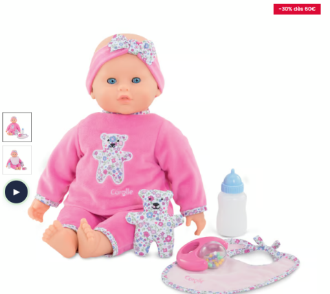Ce grand poupon intéractif Lucille de chez Corolle apporte son lot de réalisme aux histoires que votre enfant s'invente ! Sa taille de 42 cm le rend très préhensible et son corps souple facilite ses mouvements et celui de votre enfant. Huit fonctions sonores illustrent les différents états de bébé : il gazouille, rit, éternue et babille comme un vrai. Mais il réagit aussi quand votre enfant lui donne le biberon : en plus de faire le bruit de succion, il fait son rot ! Il est capable de déclencher une berceuse et en retour, votre enfant le berce pour qu'il s'endorme. Au total, 20 sons et 4 accessoires dont certains interactifs permettent à votre enfant de s'inventer mille et une histoires pour faire comme les grands.