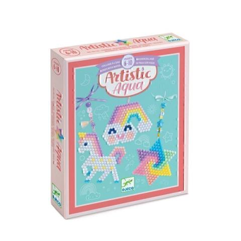 Ce coffret artistic aqua arc-en-ciel Djeco invite votre enfant à créer trois suspensions aux couleurs pastels. Après avoir placé le modèle sous la plaque transparente, il positionne les billes colorées pour reproduire une licorne, une étoile et un lutin. Puis il vaporise un peu d’eau, attend que ça sèche et, magique, les billes restent collées entre elles ! Il ne lui reste plus qu’à assembler les perles, ruban et breloques pour transformer sa création en une jolie suspension décorative. Le petit plus de ce coffret artistic aqua arc-en-ciel Djeco ? La plaque alvéolée stabilise les perles pour une création simplifiée et un rendu toujours à la hauteur !