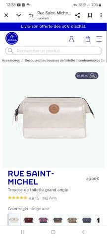 Ce produit est extrait d'une liste de cadeaux (Anniversaire, Noël, ...) déposée sur Kadolog. Kadolog permet de créer des listes de cadeaux (Anniversaire, Noël, ...) en toute liberté. Il est possible d'ajouter toutes vos envies cadeaux et de recevoir les dons directement sur votre compte. Avec les dons reçus, vous êtes alors libre d'aller acheter vos produits (comme ce 'Rue Saint-Michel - Trousse de toilette ') où et quand vous le souhaitez.