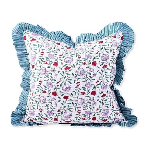 Hand printed in India, our bold blockprint pillows with ruffled edges are the perfect luxe layer to add to your mix. Bright colors with a contrast striped trim makes for a signature look.Dare to mix for an insta-worthy pillow pile.Size: 18" X 18" square with 2" ruffleMade in IndiaHidden zipper closure - please be gentl