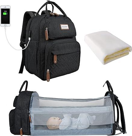 SNDMOR sac à langer pour bébé sac à dos, sacs à langer grande capacité, sac à langer de voyage portable avec lit pliable, mode imperméable (Noir)