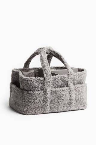 Sac à langer en doux tissu Teddy bear. Modèle doté de plusieurs compartiments pratiques qui permettent d'avoir le nécessaire à porter de main au moment du change. Séparateur intérieur amovible, maintenu par attache auto-agrippante. Deux poignées en haut. Doublure en coton. Hauteur 20 cm. Largeur 25 cm. Longueur 36 cm.