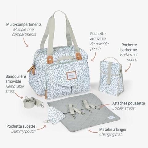 Sac à langer bandoulière avec matelas à langer, pochette à tétine, pochette repas isotherme, système d'attache poussette intégré, pochette avant amovible, longue bandoulière amovible pour portage épaule et système d'accroche trolley pour passage poignée.
