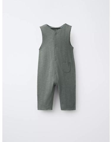 Salopette longue avec col rond et sans manches. Fermeture par boutons-pression à l'avant. Poche plaquée à l'avant.