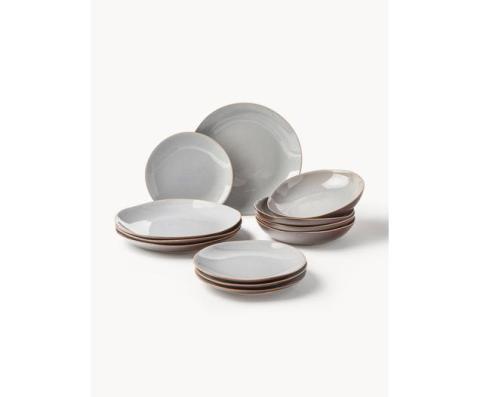Le service de table se compose 4 assiettes à dessert, 4 assiettes plates et 4 assiettes creuses avec surface texturée et bord doré