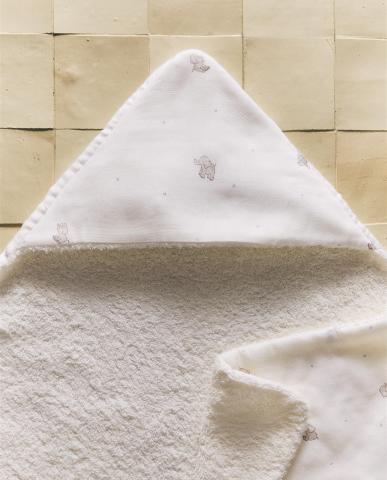 Serviette de bain à capuche pour bébé en coton éponge et gaze à motif éléphants.