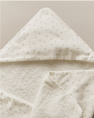 Serviette de bain à capuche pour bébé confectionnée en mini éponge de coton, avec un motif floral.