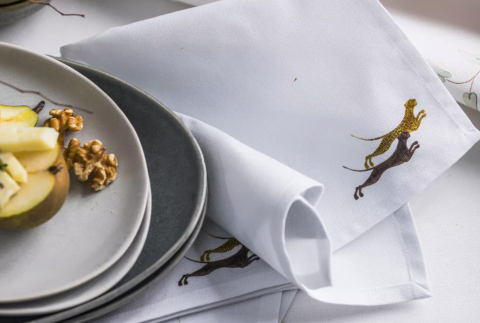 Lot de 2 serviettes de table unies blanches imprimées à l'angle de félins. 100% coton. Lavage à 40°.