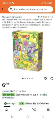 en toute liberté. Il est possible d'ajouter toutes vos envies cadeaux et de recevoir les dons directement sur votre compte. Avec les dons reçus, vous êtes alors libre d'aller acheter vos produits (comme ce 'SES Creative 14037 Colorful Sand - Inspired by Nature - Craft Kit for Kids Ages 3+ - Includes 4 Self Adhesive Art Cards with Beautiful Natural Patterns - 5 Colours : Amazon.com.be: Toys