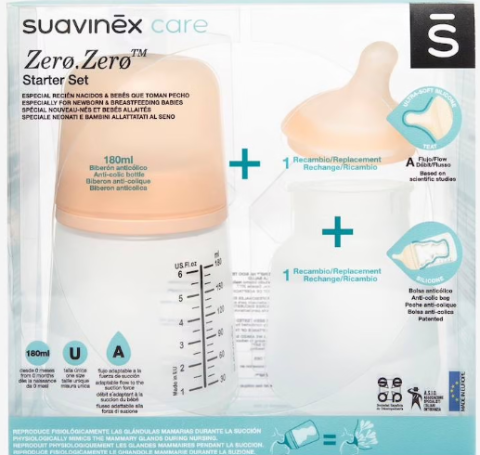 Le coffret Starter Set comprenant 1 biberon Zero.Zero 180ml, une poche en silicone supplémentaire ainsi qu'une tétine spécial allaitement (taille A) de rechange.