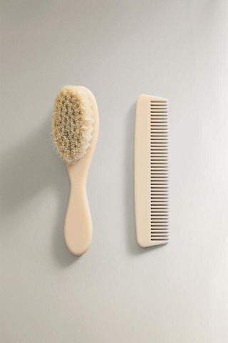 Ensemble bébé peigne et brosse en acétate avec détail de couleur contrastée, présentés dans une boîte.