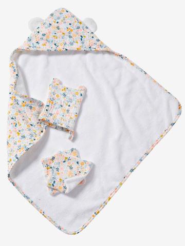 Une cape de bain pour les envelopper en douceur, un gant pour les débarbouiller et 2 lingettes pour appliquer leur soin, un