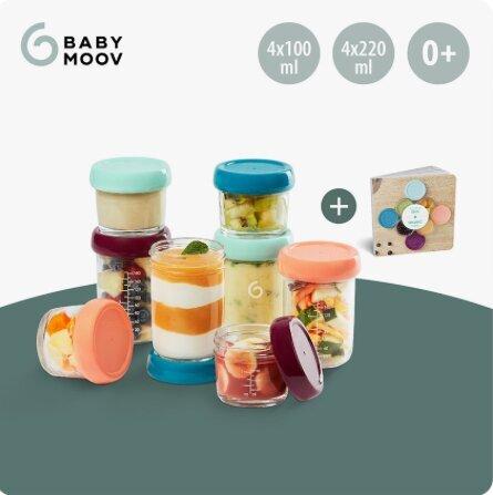 Le set de 8 Babybols en verre de BabyMoov se compose de pots de conservation écologiques qui préservent de façon durable, le goût des aliments accompagnés d’un livre de recettes Bio.