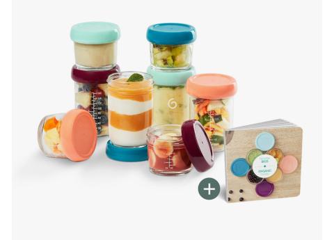 Le set de 8 Babybols en verre de BabyMoov se compose de pots de conservation écologiques qui préservent de façon durable, le goût des aliments accompagnés d’un livre de recettes pour bébé