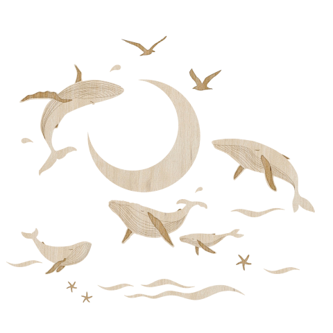 Un ensemble de baleines en bois modernes et poétiques pour décorer la chambre de votre enfant.