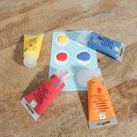 Un set contenant six tubes de peinture pour peindre avec les doigts.
