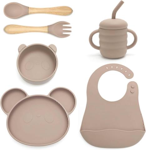 Set de repas bébé acheté sur Vinted (bavoir, bol, plusieurs couverts, gourde, assiettes)