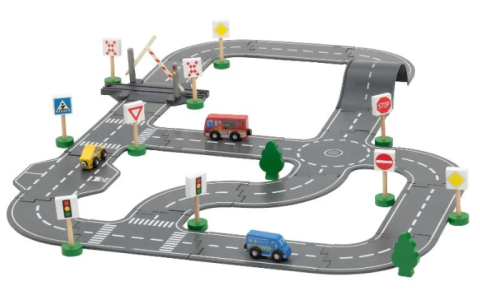 35 pièces, avec grand rond-point, pont, passage à niveau et accessoires: véhicules, panneaux de signalisation, feux de signalisation et arbres.