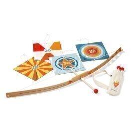 Remplissez le carquois avec les flèches en bois et embouts mousse (pour ne pas se faire mal) et installez les cibles en carton en les suspendant. Il ne reste plus qu'à tirer avec l'arc en bois pour atteindre le centre de la cible en faisant preuve de précision.