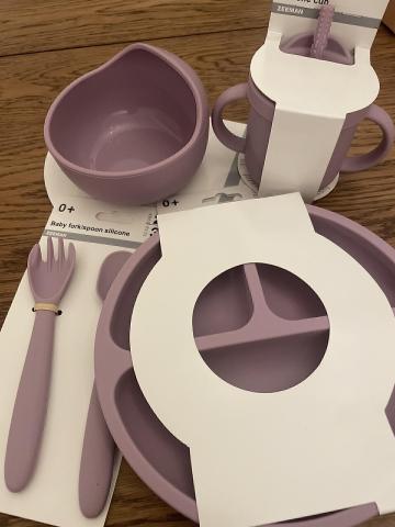 Set en silicone comprenant un bol, des couverts, une assiette à compartiments et une tasse.