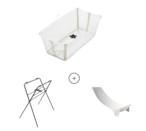 Le set baignoire pliante Flexi Bath, support baignoire et support nouveau-né de la marque Stokke réunit des produits indispensables pour la toilette et le soin de bébé.