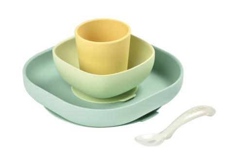 Coffret repas silicone composé d’une assiette et d’un bol avec ventouse, d’un verre et d’une cuillère 2ème âge silicone