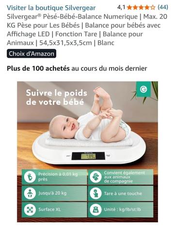 Ce produit est extrait d'une liste de naissance déposée sur Kadolog. Kadolog permet de créer des listes de naissance en toute liberté. Il est possible d'ajouter toutes vos envies cadeaux et de recevoir les dons directement sur votre compte. Avec les dons reçus, vous êtes alors libre d'aller acheter vos produits (comme ce 'Silvergear® Pèsé-Bébé-Balance Numerique | Max. 20 KG Pèse pour Les Bébés | Balance pour bébés avec Affichage LED | Fonction Tare ') où et quand vous le souhaitez.