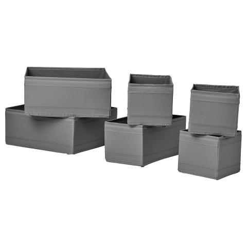 SKUBB Rangement, 6 pièces, gris foncé. Permet de ranger chaussettes, ceintures et bijoux dans votre armoire ou les tiroirs de votre commode. Lorsque vous n'utilisez pas la boîte et que vous voulez gagner de l'espace, ouvrez la fermeture dans le fond et applatissez la boîte.