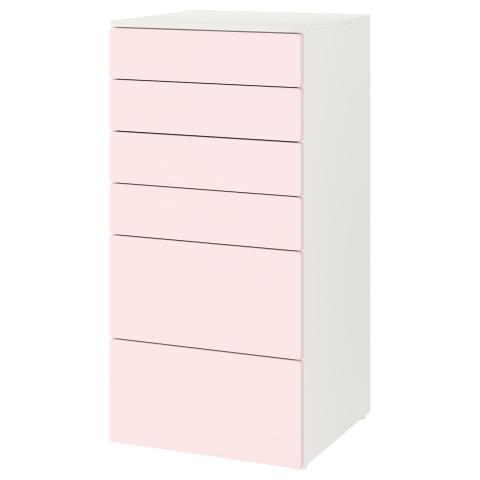 SMÅSTAD / PLATSA commode 6 tiroirs, blanc/rose pâle, 60x57x123 cm Une commode pour ranger les bodies et pyjamas quand il est bébé, puis les pulls et les pantalons quand il est plus grand. Les 2 grands tiroirs du bas peuvent servir à ranger des jouets, des couvertures et d'autres objets volumineux.