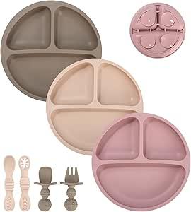SOBEAU Lot de 7 set de service de table pour bébé, en silicone, antidérapantes, avec ventouses, 3 assiettes compartimentées résistantes, 4 fourchettes/cuillères, passent au lave-vaisselle/micro-ondes : Amazon.com.be: Bébé et Puériculture