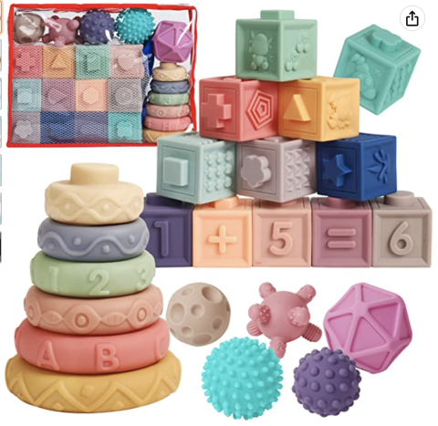 Jouets en silicone avec différentes activités avec lesquels Bébé pourra jouer autant dans son parc que dans son bain !