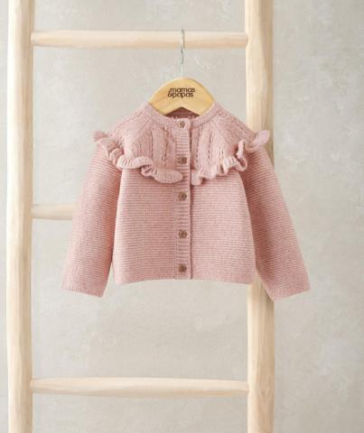 This soft pink knitted cardigan will keep them warm and cosy during the cooler seasons. Long raglan sleeves Knitted frill detail Mock wood button fastening Composition: 48% Polyester, 32% Acrylic, 20% Nylon Care & Maintenance 40 degree wash/do not bleach/cool tumble dry/cool iron/do not dry clean Safety Warnings: K