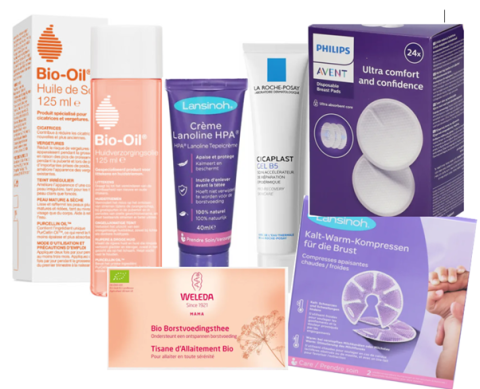 Huile vergeture, crème cicatrisante, kit allaitement (crème, thé, compresses), etc.