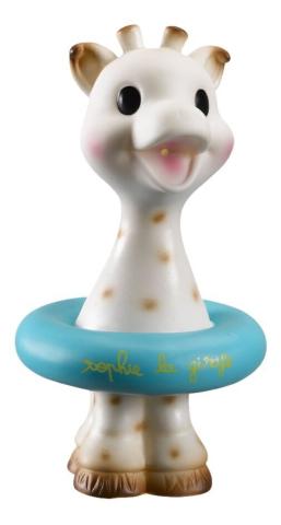 Avec sa petite bouee coloree. Sophie la girafe est paree pour plonger dans le bain avec Bebe !