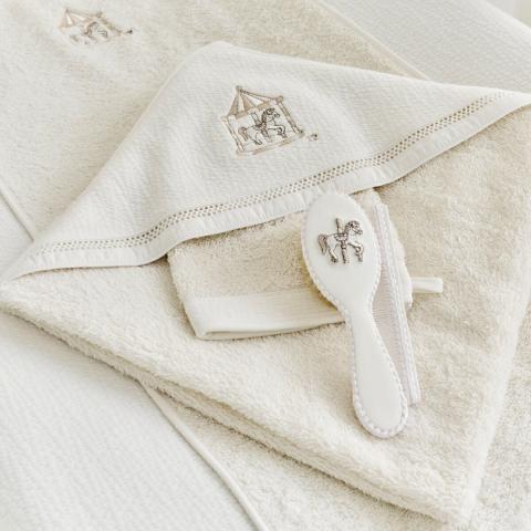 La cape de bain et le gant assorti « Carrousel » : Toute douce et moelleuse pour emmitoufler bébé dès la sortie du bain.