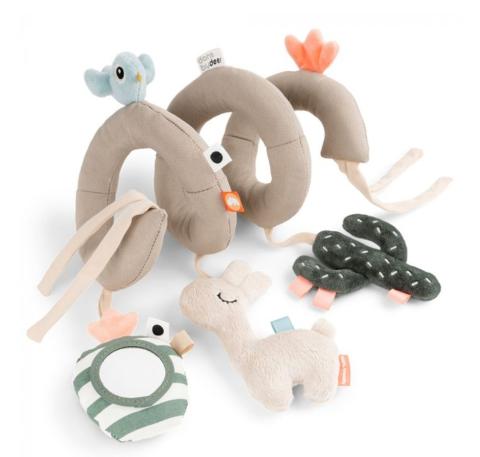 La spirale d'activités de Done by Deer est le jeu divertissant parfait pour la route. Ce jeu est doté de différentes parties sensorielles à explorer par votre petit(e). La Spirale peut être attachée au lit d'enfant, au siège auto ou à la poussette à l'aide des ficelles.