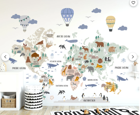 Sticker mural carte du monde et animaux 2m x 1.7m version FR