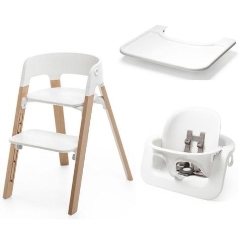 Chaise haute qui grâce au kit Babyset, peut transformer la chaise en une chaise haute confortable pour un bébé à partir d’environ six mois.