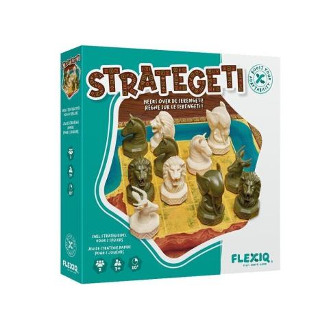 Dans le jeu 2 joueurs "STRATEGETI, Règne sur le Serengeti" de FlexiQ, vous allez placer et déplacer judicieusement vos 8 animaux et tenter soit d'aligner 4 de vos animaux, soit d'éliminer 5 animaux de votre adversaires ou encore de le bloquer.