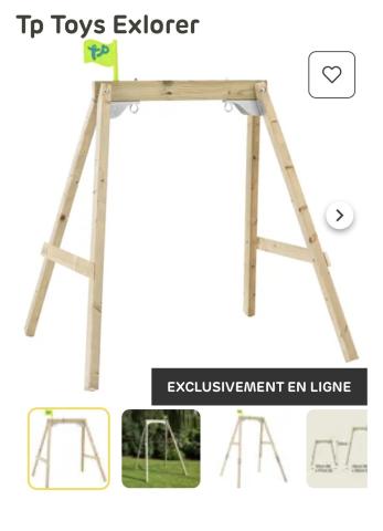 Ce produit est extrait d'une liste de cadeaux (Anniversaire, Noël, ...) déposée sur Kadolog. Kadolog permet de créer des listes de cadeaux (Anniversaire, Noël, ...) en toute liberté. Il est possible d'ajouter toutes vos envies cadeaux et de recevoir les dons directement sur votre compte. Avec les dons reçus, vous êtes alors libre d'aller acheter vos produits (comme ce 'Structure balançoire Tp Toys Exlorer ') où et quand vous le souhaitez.