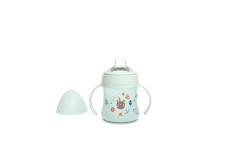 Flesje speciaal ontworpen om de overgang van zuigfles naar drinkbeker te vergemakkelijken. Een ergonomisch design met handgrepen zorgt ervoor dat de allerkleinsten dit flesje makkelijk kunnen vasthouden. De zachte silicone drinktuit is voorzien van een antileksysteem. De handgrepen en zuigspenen passen eveneens op ande