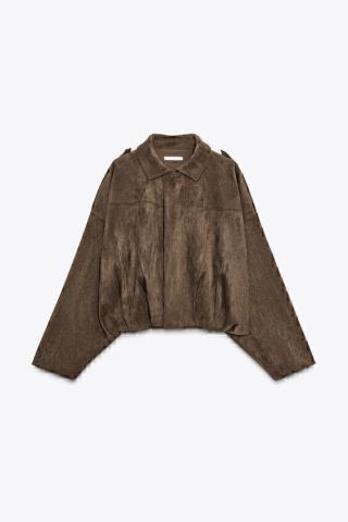 Long sleeve bomber jacket with a lapel collar and shoulder tabs. Hem finished with pleats and volume. Front fastening with a fly front and hidden buttons. Taille S
