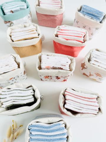 🌿 Les lingettes bébé permettent de nettoyer aussi bien le visage du bébé après le repas, que le petit derrière au moment du changement de couche !Les lingettes bébé sont un grand classique pour les cadeaux de naissance.Ici vous avez un lot de 10 lingettes, assorties à la panère. 😉Format approximatif lingette : 12 x 12 cm. Format approximatif panière : 16 cm de haut (rebord déplié), 10 de large, 13cm de profondeur. Les tissus disponibles sont repertoriés dans l'onglet "Tissus", vous pouvez choisir parmi les tissus légers et cotons unis. Délais de confection : 1 à 2 semaines Pour information : pour les tissus unis avec des pois dorés, les pois peuvent s'estomper au fil des lavages.🌿