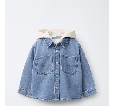 Surchemise en denim avec capuche amovible par boutons, col chemise et manches longues. Fermeture à boutonnage avant de type pression. Poches de type plaquée sur la poitrine.