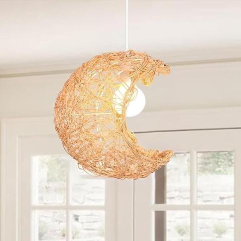 PETITES ECREVISSES Lustre Suspension en Rotin Lune étoiles Plafonnier Luminaire E27 Rétro Abat-jour Forme Lune Lampe Suspendue Ø32 cm Métal pour Enfants Chambre Cuisine Salon