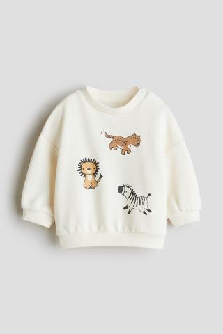Een sweater van lichte joggingstof met een print. De sweater heeft een ronde hals met een drukknoopsluiting aan één kant (niet in maat 92-104) en verlaagde schoudernaden. De hals, de mouwen en de onderkant hebben een ribboord.